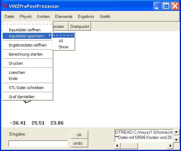 Die gespeicherten Geometriedateien fuer VINZ sind im NASTRAN-Format definiert, die Dateinamen lauten *.nas und duerfen keine Leerstellen besitzen (siehe Inpudatei oeffnen).