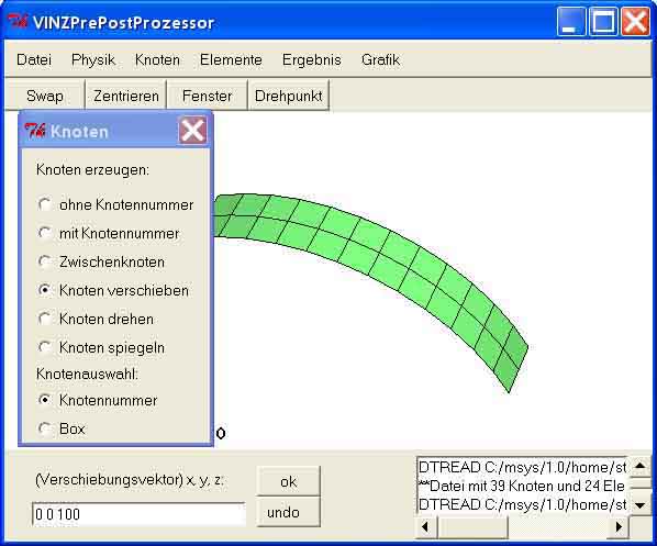 Anschliessend koennen Knoten ausgewaehlt werden. Die neuen, durch Verschiebung erzeugten Knoten, werden durch ein rotes Viereck dargestellt. Diese neuen Knoten werden aber erst gespeichert, wenn das Menu ordnungsgemaess verlassen wird. Dies erfolgt mit der return-Taste, dem ok-Button oder der rechten Maustaste, wobei das Eingabefeld leer sein muss. Die neuen Knoten werden mit einem schwarzen Viereck gezeichnet. - Ohne ordnungsgemaesses Verlassen des Menus sind die Eingaben verloren! - Solange man sich im Menu befindet, koennen mit dem undo-Button die zuletzt erzeugten Knoten wieder entfernt werden. Die Eingabe des Verschiebungsvektors kann nicht durch den undo-Button rueckgaengig gemacht werden. |