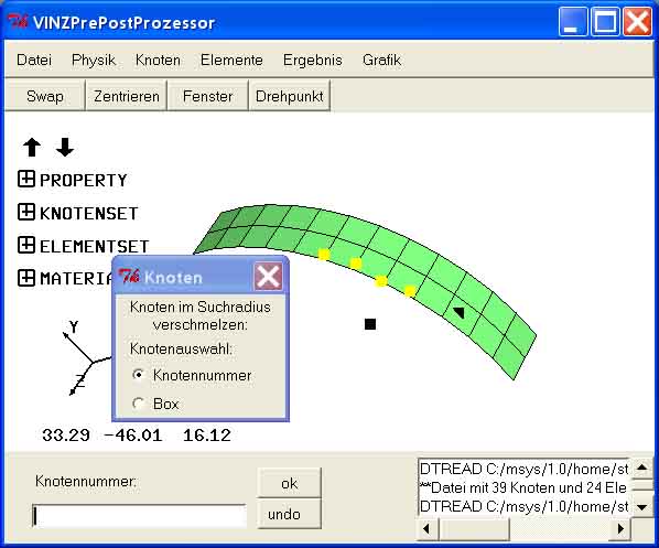 Von den moeglichen muessen die Knoten ausgewaehlt werden, die tatsaechlich verschmolzen werden sollen (Manchmal ist es auch gewollt, dass zwei Knoten einen kleinen Abstand zueinander haben). Die Verschmelzungen werden erst bei ordnungsgemaessem verlassen des Menus durchgefuehrt. Dies erfolgt mit der return-Taste, dem ok-Button oder der rechten Maustaste. - Diese Funktion kann sehr hilfreich sein, aber mit ihr kann man sein Bauteil auch sehr schnell zerstoeren. Deshalb ist sie mit aeusserster Vorsicht zu handhaben. - Ohne ordnungsgemaesses Verlassen des Menus sind die Eingaben verloren! - Solange man sich im Menu befindet, koennen mit dem undo-Button die zuletzt definierten Verschmelzungen wieder rueckgaengig gemacht werden. |